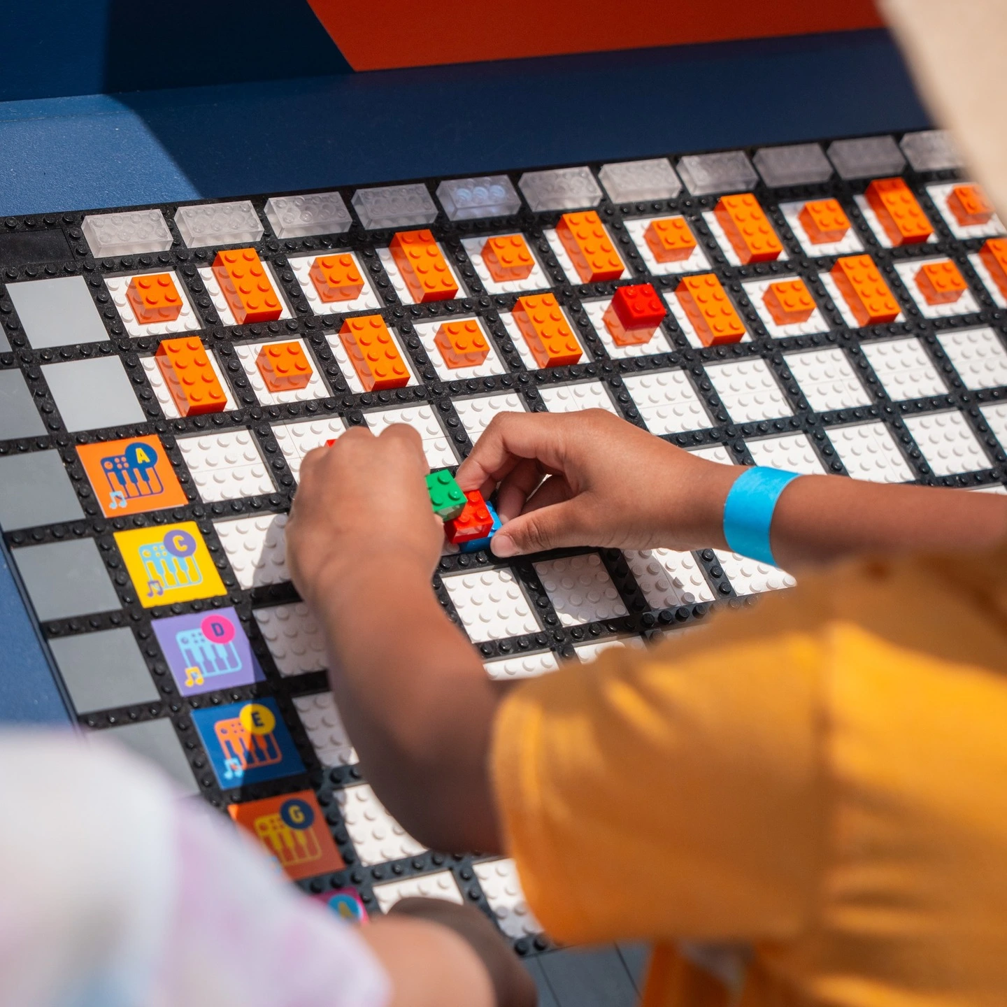 The centerpiece of The Square, The Beat Brick, was a fully interactive, kid-designed giant boombox that acted as a step sequencer. Each brick placement triggered a musical note, and even the color of the brick changed the sound.